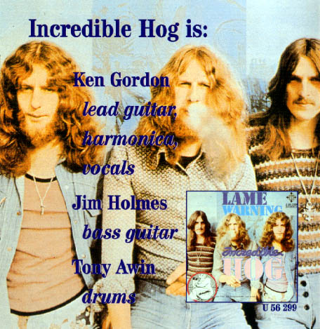Like so many early 70s bands, the three-piece London-based group Incredible Hog were a by product of the 60s British Blues Boom. In an attempt to mix melodic pop with heavy rock and intelligent, meaningful lyrics, guitarist/vocalist/songwriter Ken Gordon and bassist Jim Holmes, who'd actually been at school together and played in the band Speed Auction, formed Incredible Hog in early 1972, the name actually being a play on the then highly popular 'Incredible Hulk' comic book series.