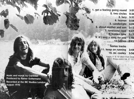 The sleeves of both Cravinkel records only stated their last names and contained no further information about these four guys. 'Cravinkel' (1970) had short tracks with a firm country-rock touch. The album was recorded in London at the IBC studios and produced by Rainer Goltermann (Phillips' "house producer"). It came in a poster fold-out cover which showed the band lazing in a haystack. 'Garden Of Loneliness' (1971) had a single cover (nice psychedelic artwork on the front!), but included a poster. Their music had by then become heavier and more "progressive" (which can be defined as: longer tracks, more time for instrumental work, and generally better albums). Side two had a 20-minute jam session called "Stoned", an apt title! It was quite a change from their first one, but indeed a logical development. This album, too, was a Goltermann production. There is also an obscure single from 1971, "Keep On Running", coupled with "Mr. Cooky" (Phillips 6003 158), neither track having been included on any of the albums.